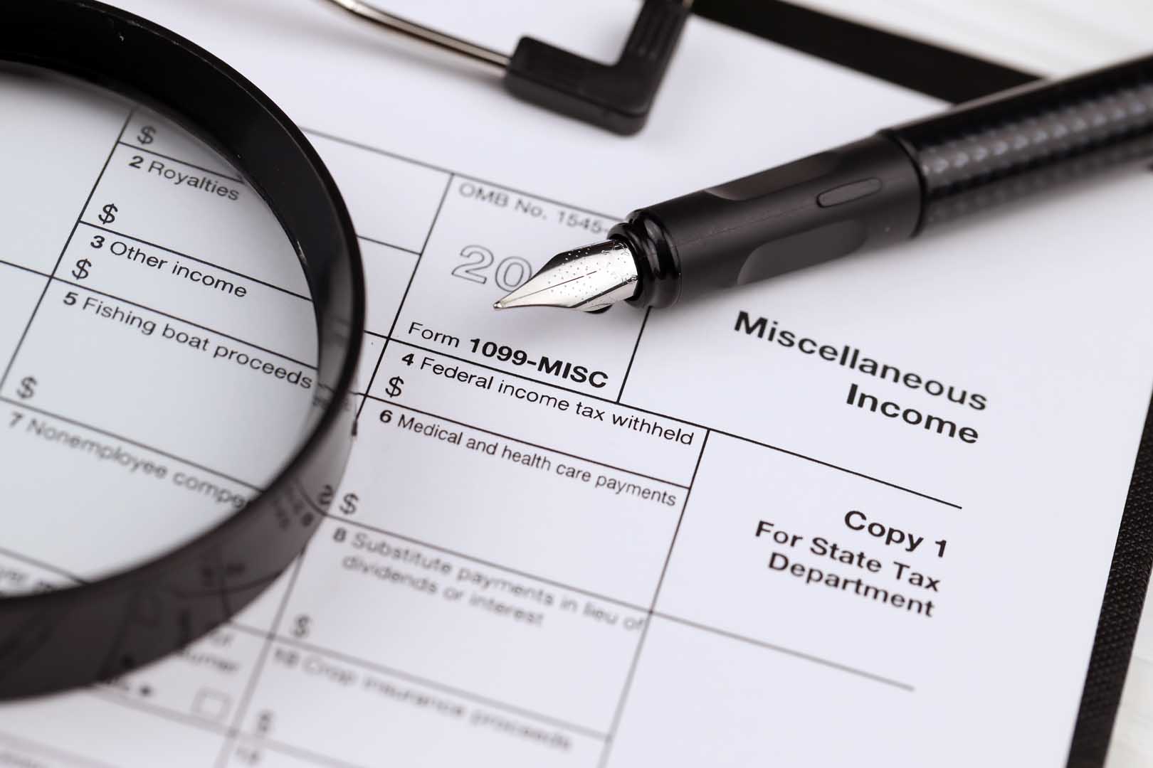 IRS Form 1099-misc Miscellaneous income blank on A4 tablet lies on office table with pen and magnifying glass close up